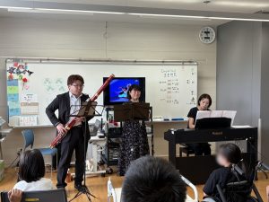 みんなが知っていそうな曲の演奏やオーボエとイングリッシュホルンとファゴット3種類の楽器の聴き比べ、楽器クイズなどで楽しくお勉強してもらいました。