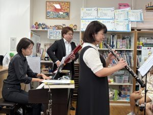 楽器クイズや3種類の楽器の聴き比べなどでオーボエとファゴットのことを少し理解してもらい、実際に楽器を触ってもらいました。